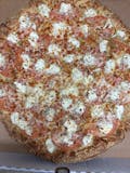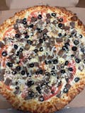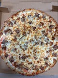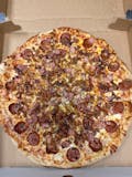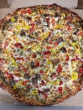 Mozzarella or provolone cheeses, pepperoni, sausage, bacon, mushroom, green pepper, hot pepper, onion, black olives, fresh garlic, and red sauce.