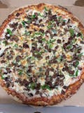 Mozzarella or provolone cheeses, chicken, BBQ sauce, mushroom, green pepper, onion, and fresh garlic.