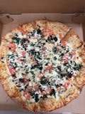 Mozzarella or provolone cheeses, sliced tomatoes, spinach, mushroom, green pepper, onion, green olives, fresh garlic red or white garlic sauce.