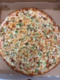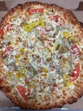 Mozzarella or provolone cheeses, tomatoes, artichoke, hot pepper, onion, chicken, feta, fresh garlic, and white garlic sauce.