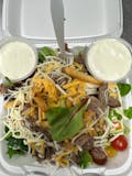 Steak, mushroom, onion, green pepper, lettuce, and tomatoes.