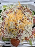 Gyro meat, black olives, feta cheese, lettuce, tomatoes, and onion.
