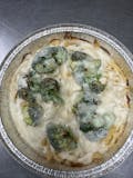 Mozzarella or provolone cheeses, tomatoes, fresh broccoli, fontinella cheese, fresh garlic, and white garlic sauce.